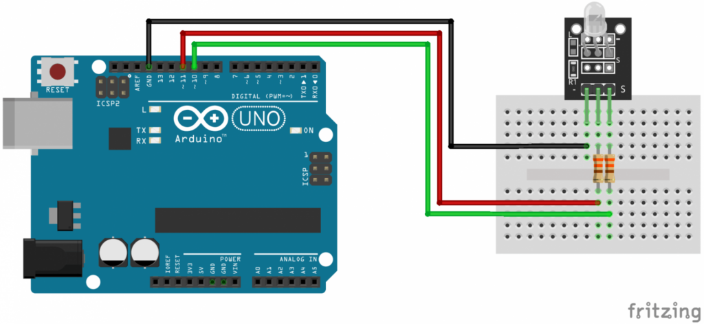 We’ll use a couple of 330Ω resistors to limit the current from the Arduino and prevent burning the LED.