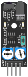 The module has a pair of infrared LEDs, an emitter, and a receiver. The emitting LED sends infrared light pulses at a certain frequency. When the light hits an obstacle is reflected back to the receiver LED.