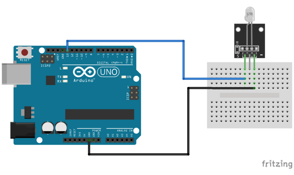 In the following sketch, we’ll use the pin 13 on the Arduino to repeatedly turn the LED on the module on for 3 seconds and off for a second.