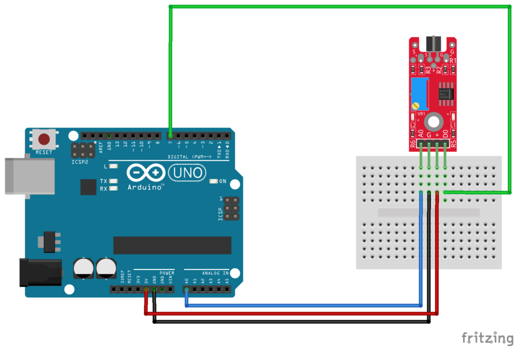 Connect the module’s analog output (A0) to pin A0 on the Arduino, and the digital output (D0) to pin 7.