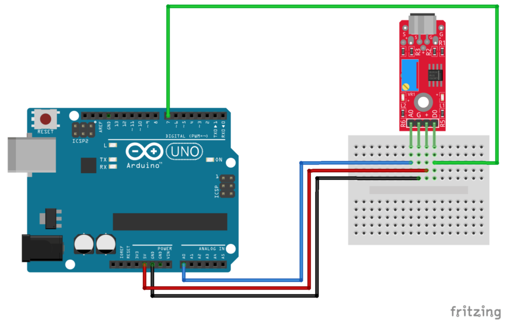 Connect the module’s analog output (A0) to pin A0 on the Arduino, and the digital output (D0) to pin 7.