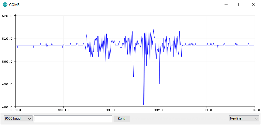 }Use Tools > Serial Plotter on the Arduino IDE to visualize the values on the analog output.