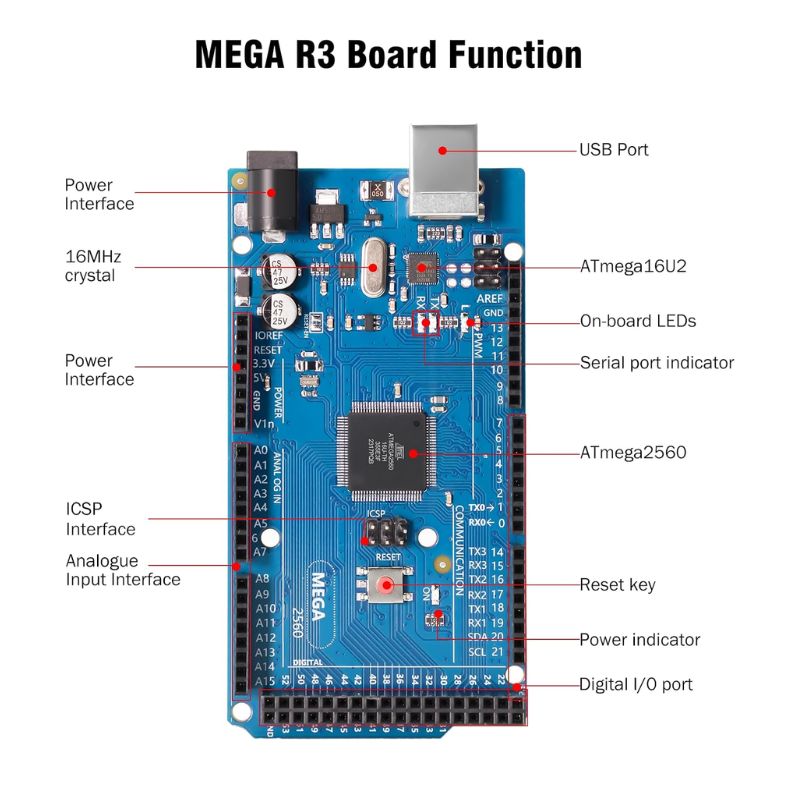 - Mega 2560 R3 Board: ATmega 2560 With 256KB of flash memory space, it provides powerful performance and diverse I/O options, can handle large-scale programs, and is an ideal choice for projects that require a lot of computing resources.