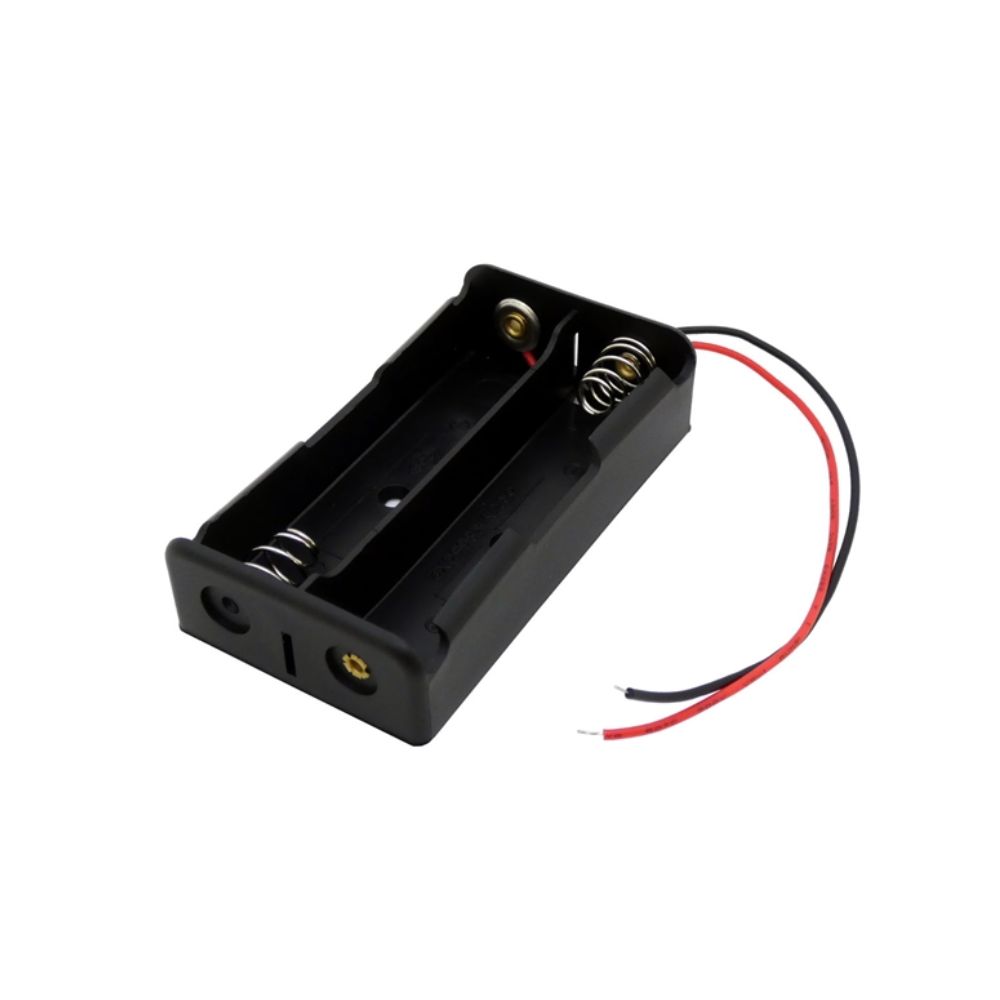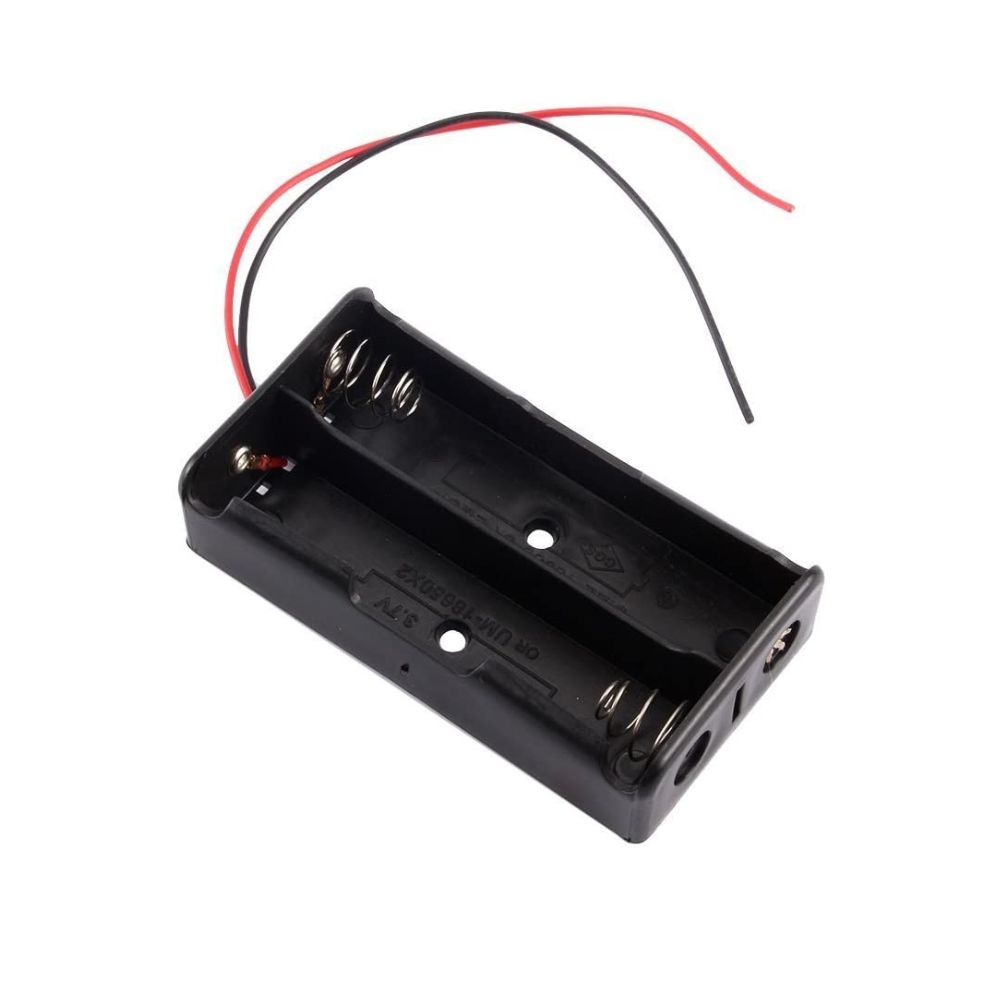 This 18650 battery case holds two (2) 18650 lithium-ion batteries connected in series, providing approximately 7.4V output (~3.7V x 2 = 7.4V). The holder includes output leads approximately 6″ long for soldering or connecting to your circuit.
