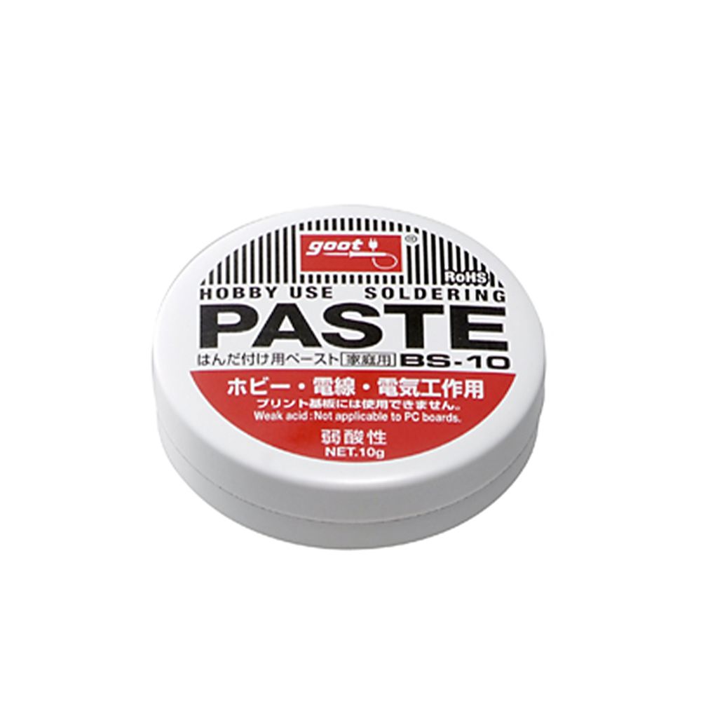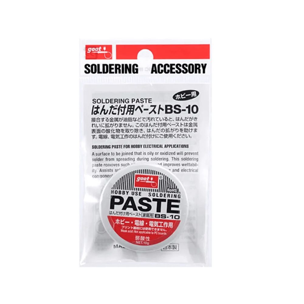 Soldering Paste GOOT 10g Original is good for cables and large terminals. Removes oil or oxides, and improves wetness. NOTE: BS-10 is a weakly acidic paste. Cannot be used on PCBs.